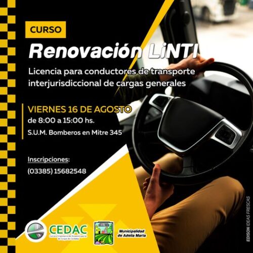 29 julio, 2024La Municipalidad de Adelia María informa que se llevará a cabo el Curso de Renovación de LiNTI (Licencia para conductores de transporte interjurisdiccional de cargas generales) el viernes 16 de […]