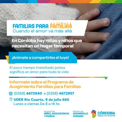 11 enero, 2024El programa Familias para Familias hace un llamado especial a grupos familiares de los departamentos Punilla y Río Cuarto para sumarse al programa. La Secretaría de Niñez, Adolescencia y Familia […]
