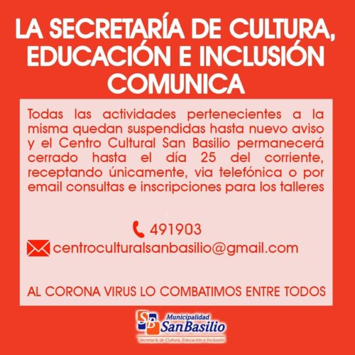 18 marzo, 2020Además, el Centro Cultural permanecerá cerrado.