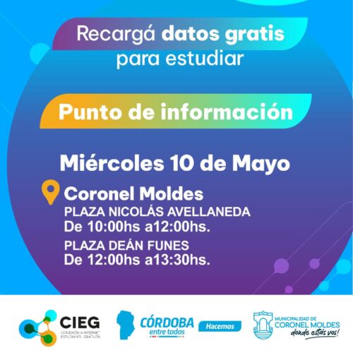 9 mayo, 2023La Municipalidad de Coronel Moldes informa que ya están abiertas las inscripciones para el programa Provincial de recargar gigas gratis para estudiar . La Municipalidad de Coronel Moldes informa que ya […]