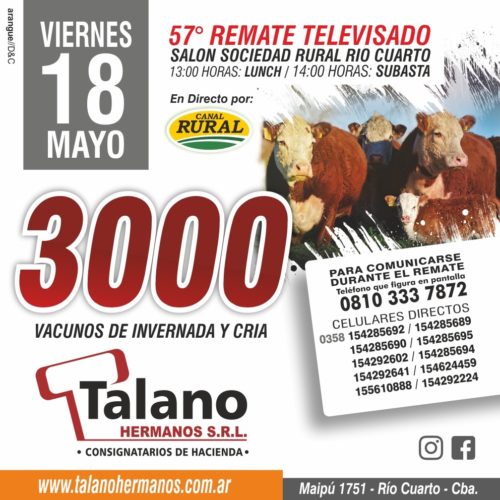17 mayo, 2018Viernes 18 de mayo 13:00 horas: LUNCH 14:00 horas: SUBASTA GENTILEZA: TALANO HERMANOS S.R.L