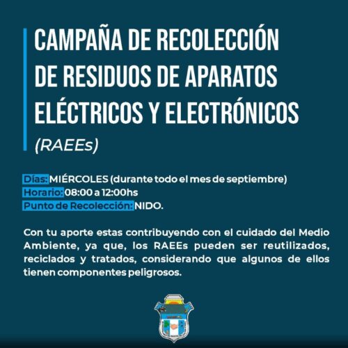 6 septiembre, 2022•Día de recolección: Miércoles (durante todo el mes de Septiembre). •Horario: 08:00 a 12:00hs. •Lugar: NIDO. Apostamos al compromiso de toda la población por el cuidado del Medio Ambiente y […]