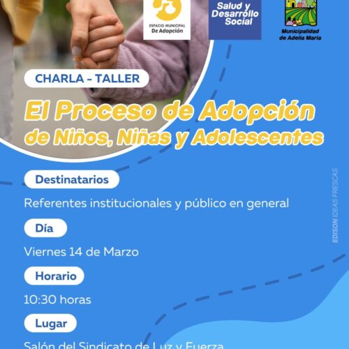13 marzo, 2025El Área de Desarrollo Social de la Municipalidad de Adelia María invita a la charla-taller: El proceso de adopción de niños, niñas y adolescentes, a cargo del Lic. Luis Luco […]