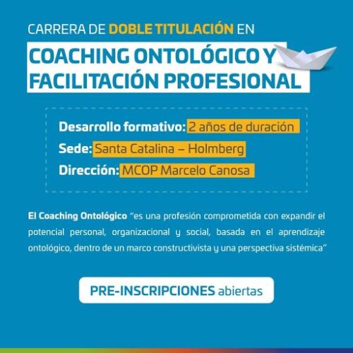 4 octubre, 2024Presentamos a la comunidad una nueva propuesta formativa. Carrera de doble titulación: “Coaching Ontológico y Facilitación Profesional»- Formación 2025/2026 Duración: 2 años Sede: Santa Catalina El Coaching Ontológico «es una […]