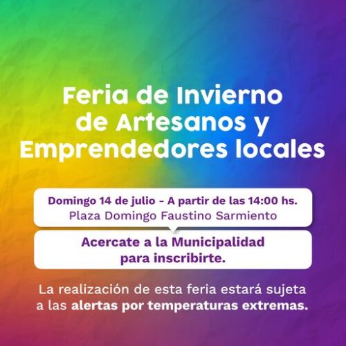 12 julio, 2024El domingo 14 de julio, a partir de las 14:00 hs y en la Plaza Domingo Faustino Sarmiento. Acercate a la Municipalidad para inscribirte. La realización de esta feria estará […]