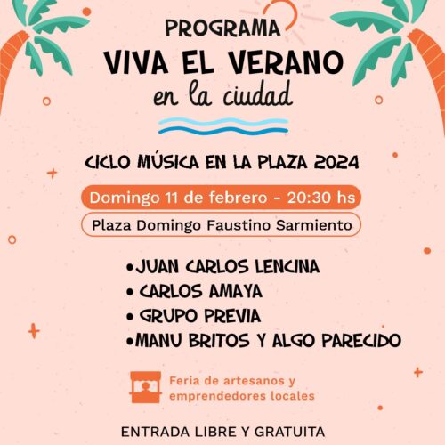 6 febrero, 2024CICLO: MÚSICA EN LA PLAZA 2024 🗓️ Domingo 11 de febrero – 20:30hs. 📌 Plaza Domingo Faustino Sarmiento • Juan Carlos Lencina • Carlos Amaya • Grupo Previa • Manu […]