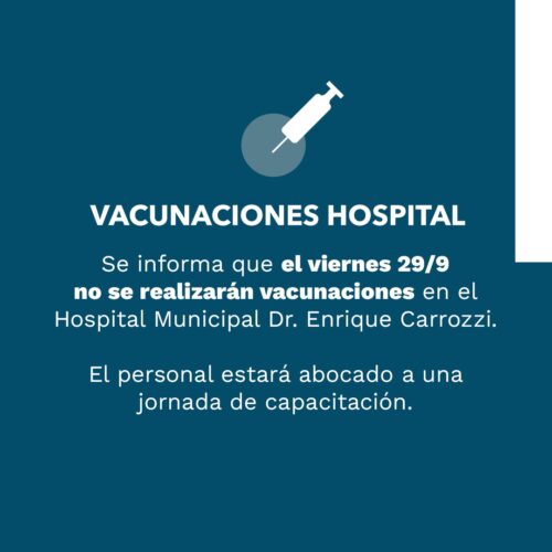 26 septiembre, 2023El Hospital Municipal de Vicuña Mackenna informó una modificación en las fechas de vacunaciones. El Hospital Municipal de Vicuña Mackenna, Dr. Enrique Carrozzi comunica que el día Viernes 29/9 se […]