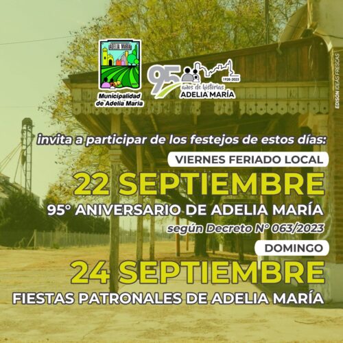 5 septiembre, 2023El 22 de Septiembre será feriado local y el Domingo 24 se celebrarán las fiestas patronales. En Septiembre, nuestro pueblo de Adelia María cumple 95 años de historia y cultura. […]