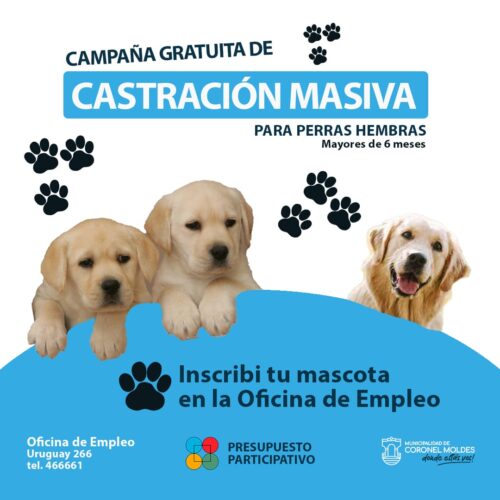 22 agosto, 2023La Municipalidad de Coronel Moldes lanzó una campaña masiva de Castración para perras hembras mayores de 6 meses. ¿Querés cuidar la salud de tu perrita y evitar la sobrepoblación de animales? […]
