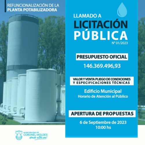 18 agosto, 2023Llamado a licitación pública para la refuncionalización de la plata potabilizadora de Coronel Moldes. La Municipalidad invita a los interesados a participar en la licitación pública para la ejecución del […]