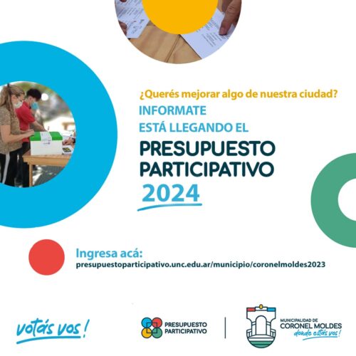 30 junio, 2023El día Miércoles 5 de Julio, la Municipalidad de Coronel Moldes lanza la 4ta edición del Presupuesto Participativo 2024. ¿Quieres participar en la gestión de tu municipio? ¿Tienes ideas para […]