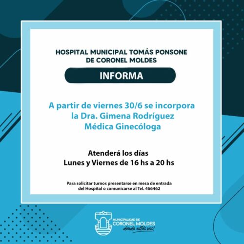 27 junio, 2023El Hospital Municipal Tomas Ponsone de Coronel Moldes informa una nueva incorporación. El Hospital Municipal Tomas Ponsone de la localidad de Coronel Moldes, comunica que desde el viernes 30/6 contará con […]