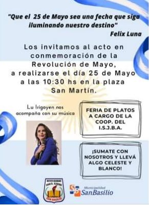 22 mayo, 2023La Municipalidad de San Basilio invita a todos los vecinos de la localidad a participar del acto en Conmemoración de la Revolución de Mayo el Jueves 25 a las 10: […]