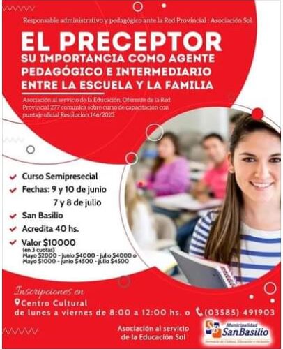 22 mayo, 2023Ya se encuentran abiertas las inscripciones para el curso, con puntaje oficial, de Preceptor. La Municipalidad de San Basilio informó que se encuentran habilitadas las inscripciones para el curso de […]