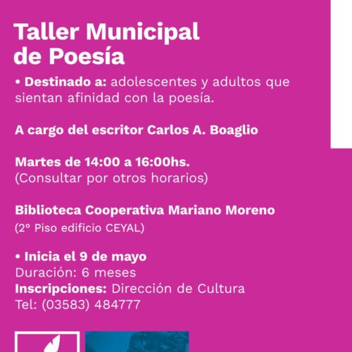 20 abril, 2023Se encuentran abiertas las inscripciones para el Taller Municipal de Poesía en Vicuña Mackenna a cargo del escritor Carlos A. Boaglio. Se encuentran abiertas las inscripciones para el Taller Municipal […]
