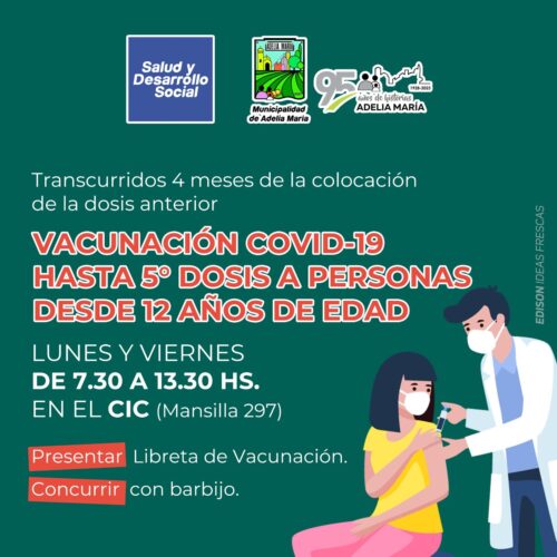 13 abril, 2023La Municipalidad de Adelia María está realizando la vacunación a personas mayores de 12 años de edad, de la dosis de refuerzo de Covid-19 los días Lunes y Viernes en […]