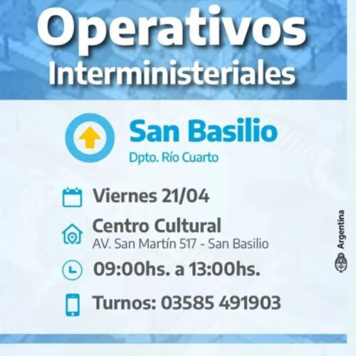 14 abril, 2023El Viernes 21 de Abril de 9 a 13 hs se realizará un operativo interministerial de la Nación en San Basilio, en donde los vecinos de la localidad podrán realizar […]