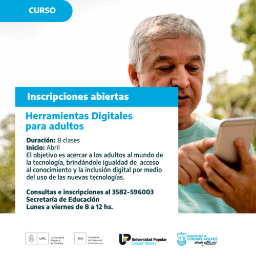 23 marzo, 2023Ya se encuentran habilitadas las inscripciones para realizar el curso de Herramientas Digitales dictado por la Universidad Popular de Coronel Moldes. Las clases arrancan en Abril y constará de 8 […]