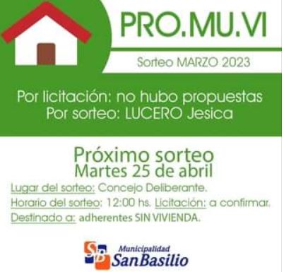 27 marzo, 2023El Martes 25 de Abril se llevará a cabo el sorteo del plan de viviendas PRO. MU. VI. en el Concejo Deliberante de San Basilio. En Abril se realizará el […]