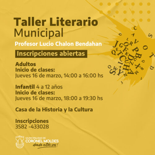10 marzo, 2023Se encuentran abiertas las inscripciones para el Taller Literario Municipal en Coronel Moldes. Las clases se dictarán todos los días Jueves en diferentes horarios de acuerdo a las edades. La […]