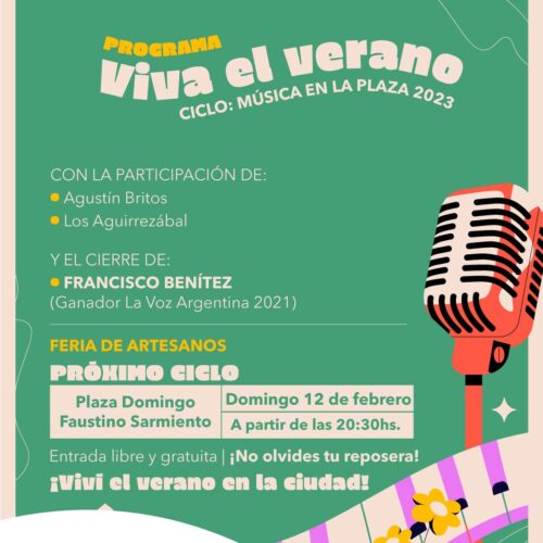 7 febrero, 2023El Domingo 12 de Febrero a partir de las 20: 30 hs se realizará otra noche más del Programa Viva el Verano: Música en la Plaza 2023. Con la participación […]