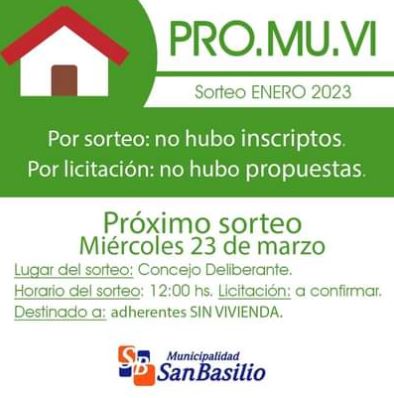 30 enero, 2023El 23 de Marzo se realizará el sorteo por las viviendas pertenecientes al programa PRO.MU.VI en la localidad de San Basilio. El Programa Municipal de Viviendas de la localidad de […]