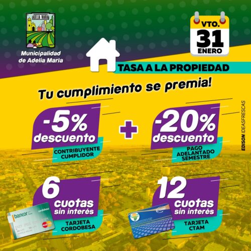 23 enero, 2023Estar al día con el pago de tus impuestos trae sus beneficios. La Municipalidad de Adelia María premia con 5% de descuento al Contribuyente Cumplidor, al que se le suma 20% […]