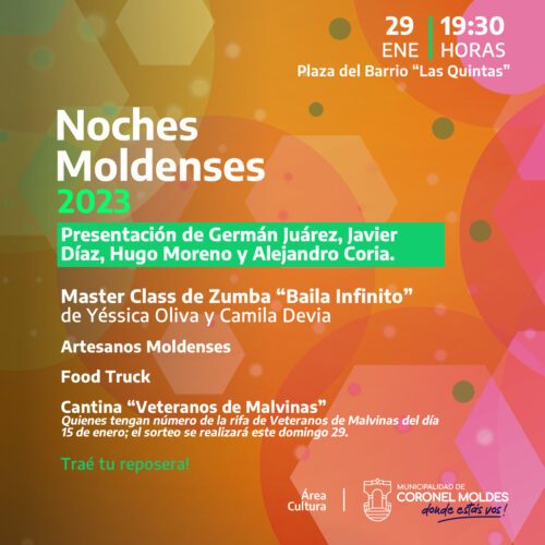 25 enero, 2023Tercera noche de música, espectáculos, artesanos y food truck, el próximo domingo en la Plaza del Barrio Las Quintas. Tercera noche del ciclo organizado por la Municipalidad de Coronel Moldes […]