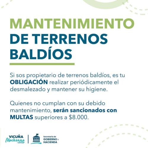 3 enero, 2023Es una obligación para los propietarios de los terrenos baldíos de la localidad de Vicuña Mackenna realizar periódicamente el desmalezado y limpieza de los mismos. La Municipalidad de Vicuña Mackenna recordó […]