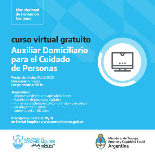 3 enero, 2023Curso gratuito de Auxiliar Domiciliario para el Cuidado de Personas con una duración de 4 meses y una carga horaria de 98 horas, las inscripciones se realizarán hasta el 20 […]