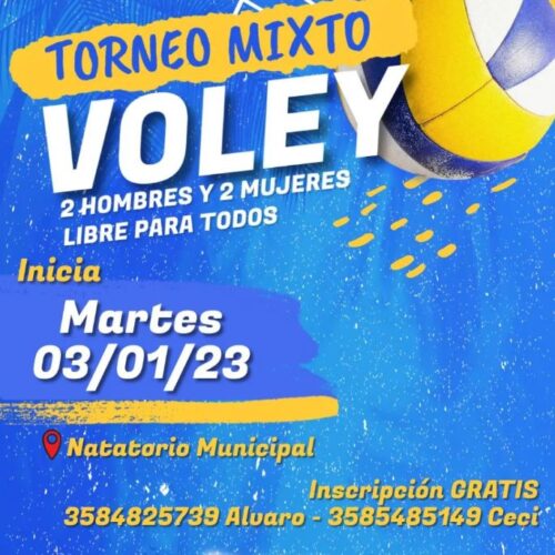 2 enero, 2023Martes 3 de Enero se desarrollará en el Natatorio Municipal, un Torneo Nocturno de Voley, femenino y masculino y libre de categoría. Ya se encuentran abiertas las inscripciones con Cecilia […]