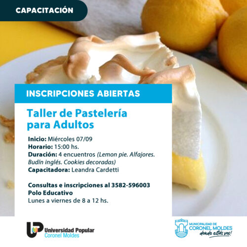 26 agosto, 2022La Municipalidad de Coronel Moldes comenzó con la inscripciones para el Taller de Pastelería para Adultos impulsados por la Universidad Popular. Ya se encuentran abiertas las inscripciones para realizar el […]