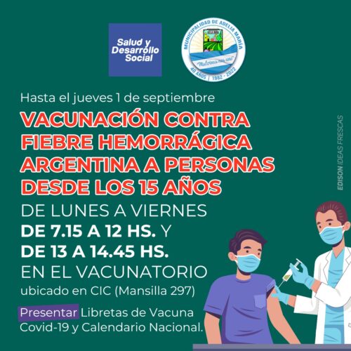 26 agosto, 2022El Vacunatorio Municipal de Adelia María está realizando la vacunación contra la Fiebre Hemorrágica Argentina. Hasta el próximo Jueves 1 de Septiembre, el vacunatorio Municipal de Adelia María, estará realizando […]