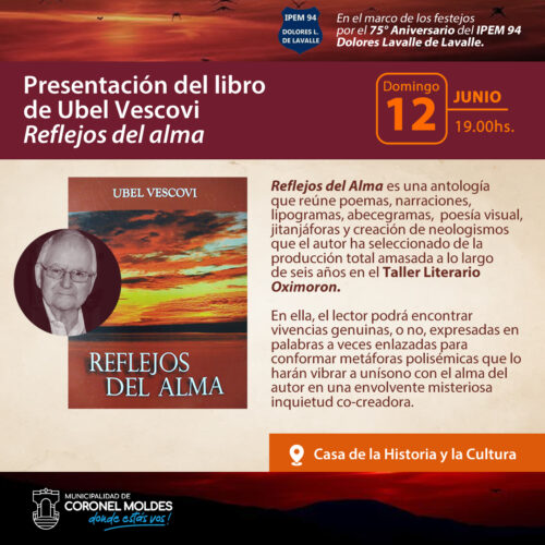 7 junio, 2022El Domingo 12 de Junio a las 19 Hs, se presentará en la Casa de la Historia y la Cultura el libro Reflejos del Alma del escritor Ubel Vescovi, una […]