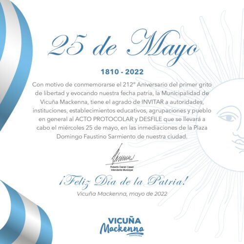 16 mayo, 2022La Municipalidad de Vicuña Mackenna invita a participar este 25 de Mayo del Acto Protocolar y Desfile, en la plaza Domingo Faustino Sarmiento, a partir de las 9:00 hs. Con […]