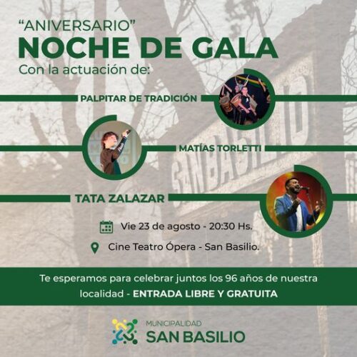 22 agosto, 2024Este viernes 23 de agosto, te invitamos a celebrar el 96° Aniversario de nuestro Pueblo. Actuarán Palpitar de Tradición, Matías Torletti y el cierre de la noche con Tata Zalazar. […]