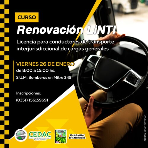 17 enero, 2024La Municipalidad de Adelia María informa que se llevará a cabo el Curso de Renovación de LiNTI (Licencia para conductores de transporte interjurisdiccional de cargas generales) el Viernes 26 de […]