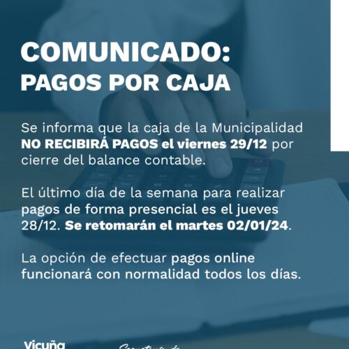 27 diciembre, 2023La Municipalidad informa que el Viernes 29/12 la caja estará cerrada por lo que no se recibirán pagos en efectivo hasta el día Martes 2/01/2024. Les comunicamos que la caja […]