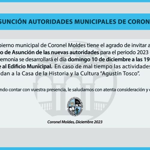 6 diciembre, 2023Este Domingo 10 de Diciembre se realizarpa el Acto de Asunción de Autoridades Electas. El próximo Domingo 10 de Diciembre se realizará el Acto de Asunción de las nuevas autoridades municipales […]