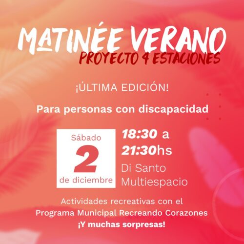28 noviembre, 2023Este Sábado 2 de Diciembre se realizará la última edición de la Matinée Verano para personas con Discapacidad. El Sábado 2 de Diciembre en Di Santo Multiespacio de Vicuña Mackenna […]