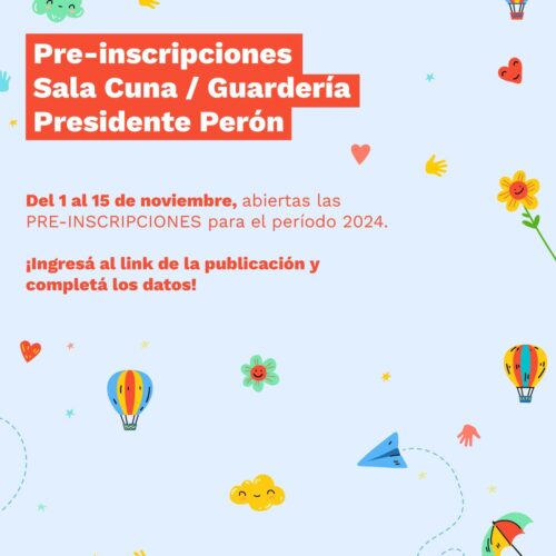 1 noviembre, 2023Se encuentran abiertas las pre-inscripción para la Sala Cuna/Guardería de Vicuña Mackenna. La Sala Cuna/Guardería Presidente Perón de Vicuña Mackenna les informamos que desde el 1 hasta el 15 de […]