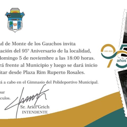 26 octubre, 2023La Municipalidad de Monte de los Gauchos invita a los vecinos a participar el día Domingo 5 de Noviembre del Acto Protocolar por la fundación del pueblo. Ven a celebrar con […]