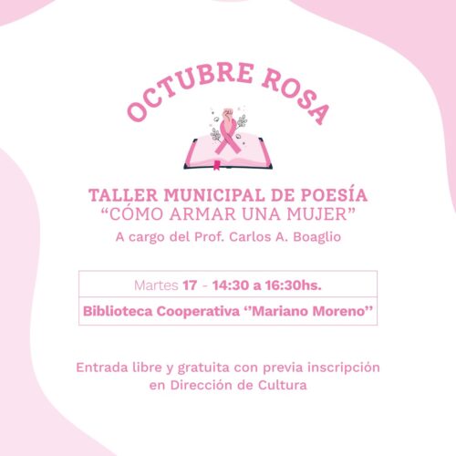 12 octubre, 2023Este Martes 17 de Octubre se desarrollará un taller Municipal de poesía: «Cómo armar una Mujer» a cargo del Prof. Carlos A. Boaglio. En el mes de la prevención del […]