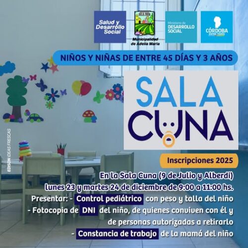 20 diciembre, 2024La Sala Cuna “Jardín Encantado” informa que se llevarán a cabo las inscripciones de niños y niñas de entre 45 días de vida y 3 años de edad. Este equipado […]