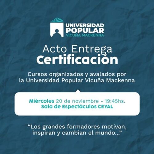 18 noviembre, 2024Acto Entrega de Certificación Cursos organizados y avalados por la Universidad Popular Vicuña Mackenna Miércoles 20 de noviembre – 19:45 hs. Sala de Espectáculos CEYAL «Los grandes formadores motivan, inspiran […]