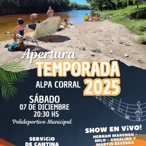 22 noviembre, 2024El sábado 7 de diciembre abrimos la temporada 2024-2025 en Alpa Corral Te esperamos en el Poli para disfrutar juntos Arranca el verano en las sierras del sur Municipalidad de […]
