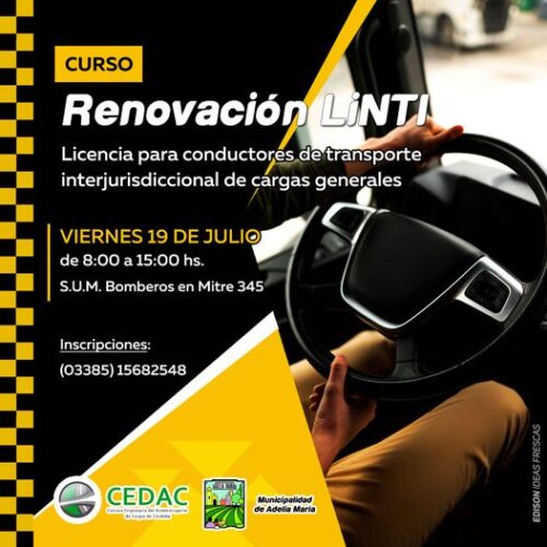 8 julio, 2024La Municipalidad de Adelia María informa que se llevará a cabo el Curso de Renovación de LiNTI (Licencia para conductores de transporte interjurisdiccional de cargas generales) el viernes 19 de […]