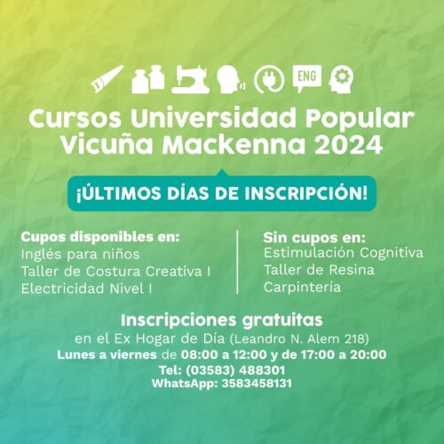 5 abril, 2024Cupos disponibles en: Inglés para niños – Taller de Costura Creativa I – Electricidad Nivel I ❌ Sin cupos en: Estimulación Cognitiva – Taller de Resina – Carpintería […]