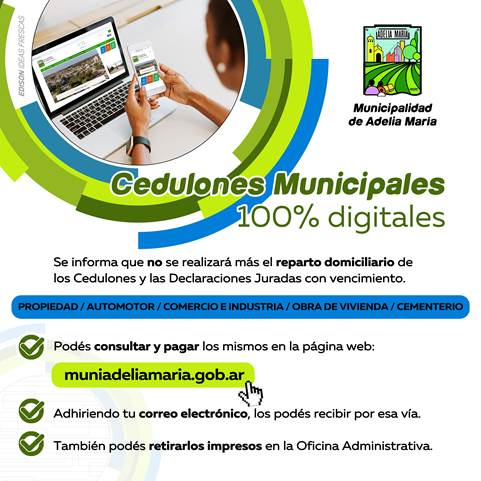 5 marzo, 2024La Municipalidad de Adelia María informa que a partir de marzo no realizará el reparto domiciliario de Cedulones y Declaraciones Juradas con vencimiento. Desde tu dispositivo, podés consultar y pagar los mismos […]
