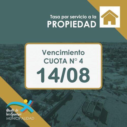 7 agosto, 2025La Municipalidad de Monte de los Gauchos te informa que de la Tasa por Servicio a la Propiedad vence la 4° cuota y el pago adelantado del segundo semestre el […]